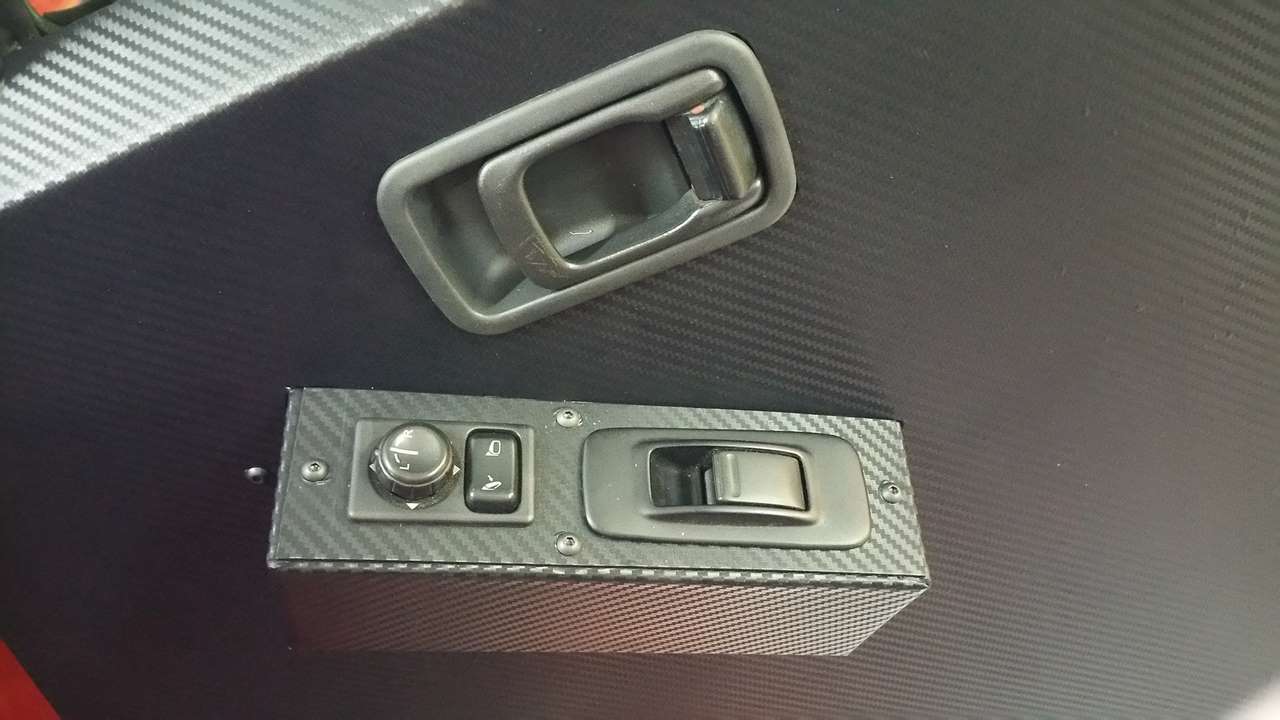 Sept-2017 : The Original door panels were never going to fit after the roll cage was installed so I manufactured new panels from aluminium sheet. The winder lift mechanism was deleted from the passengers door so the resulting door panel is flat with no switches, I had to retain the drivers side window mechanism and the electric mirror controller. The finish is vinyl wrap :( |